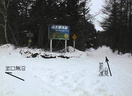 ほとんど平らな林道を歩くとまもなく十字路。真っ直ぐ行けば口無沼、右折すれば丸山遠見です。(看板有り)