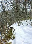 湖畔温泉からも入れますが、駐車場の便から言うと、国民休暇村から入る方が便利でしょう。休暇村周辺の森は平らで歩きやすいのですが、遊歩道に入ると起伏のある狭いコースとなります(かんじきだと快適だろうなあ)。