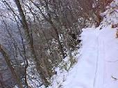 湖岸沿いの平地が急になくなり、湖岸が切り立った地点に着くとちょうどそこが電光坂への登り口。スキーを担いで一汗流しましょう。