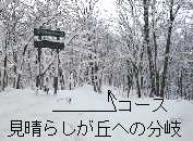 正規のルートは中央園地手前から左折して、東山の三叉路を経由しますが、このコースはアップダウンが多く道も不明瞭なので、中央園地を通り過ごしてから、この看板を目印に左折し、見晴らしが丘を目指した方が無難でしょう。この道は広く明瞭で傾斜も緩いので、初心者でも心配ありません。中央園地までのコース紹介は、野鳥観察・眺望コースを参照して下さい。