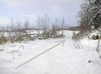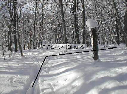 ここから道はもっと不明瞭になってまた歩きにくくなりますので、ここらへんで右折して北に向かい、展望園地と中央園地の間の稜線に向かった方が楽でしょう。なだらかな疎林の、道なき道を登る、ちょっとした山スキー気分がほんのちょっとだけ味わえます。