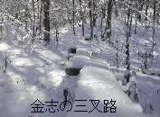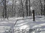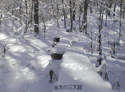 下りきると木道があって、そこを辿ると金志の三叉路です。ここから2本ほど深い小沢を道なりに渡ると、右の写真の地点に着きます。写真では分かりにくいですが、赤ペンキが塗ってあり、鉈で刻みが付けられている、途中で切られたこの木が目印です。