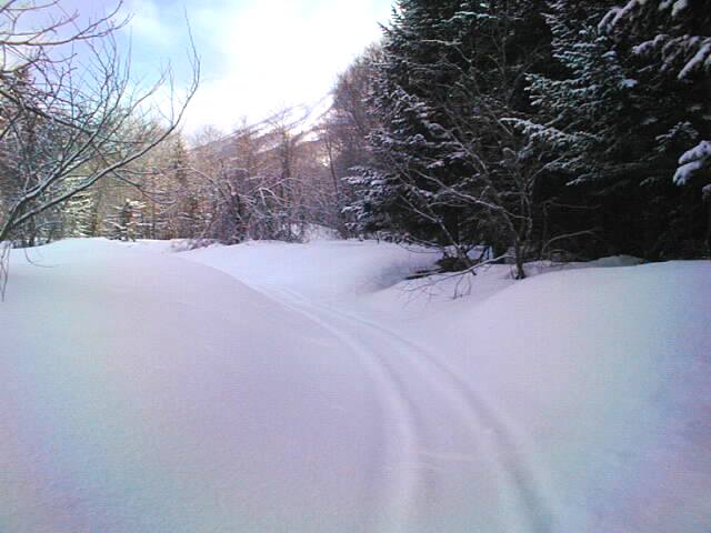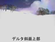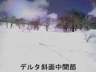 標高1400mから上は、森林限界となり、厳冬期は氷の世界。またデルタ大斜面より斜度がきつくなりますので、雪が腐り始める4月後半以降にならないと、スキー滑降はかなりシビアになるでしょうが、ここも幅が広く楽しめます。