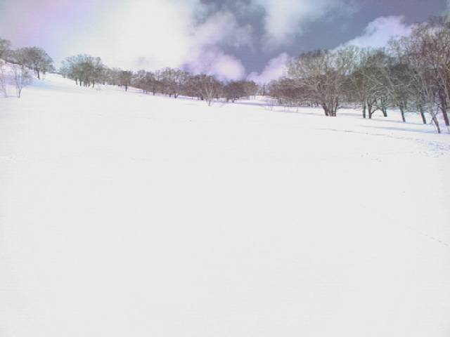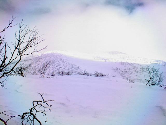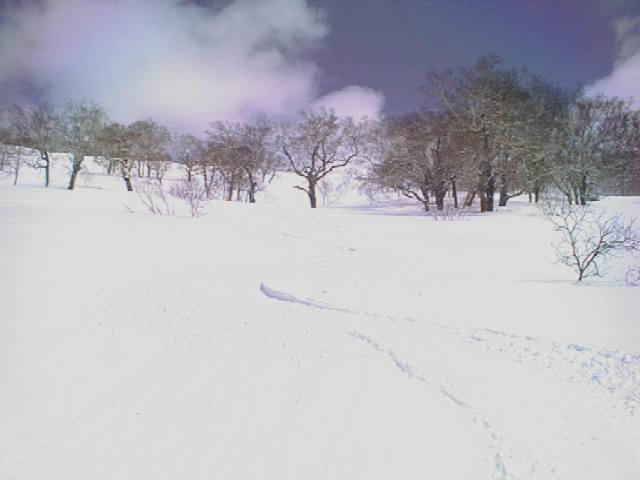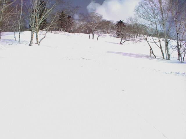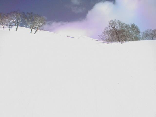 ここから標高1400m地点の森林限界まで、ご覧のダイナミックな、しかも風の影響を受けにくい凹状の疎林の、北海道でも指折りの大斜面が広がります。傾斜も滑落するほどきつくないので、中級者でも大丈夫。但しこれだけのオープンな斜面ですから、厳冬期は特に、雪崩の警戒を怠らないで下さい。