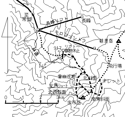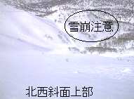 斜面上部は急なため、アイスバーン時は滑落に、また下に向かって左側からの雪崩・雪庇崩落にもご注意下さい。