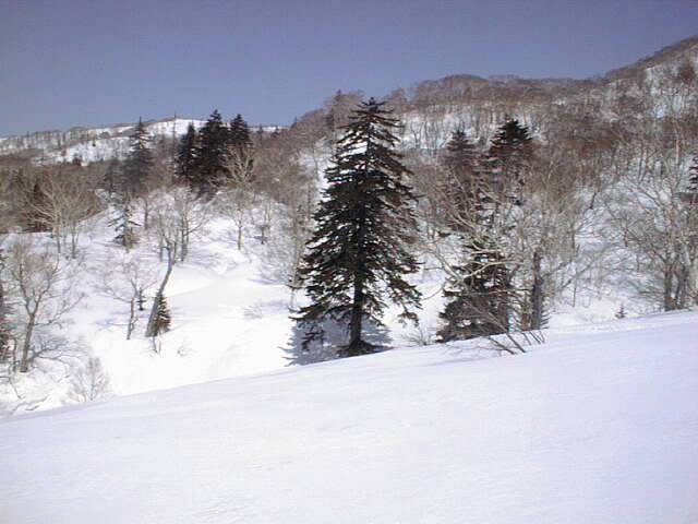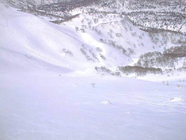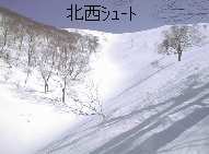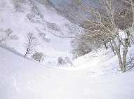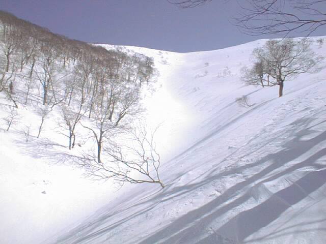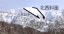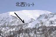 北西斜面の雪付きが悪い時でも、この北西シュートには、沢形に細長く雪が付いている事が多く、狭いながらも天然のパイプのような地形で標高差もあり、結構楽しめます。