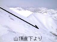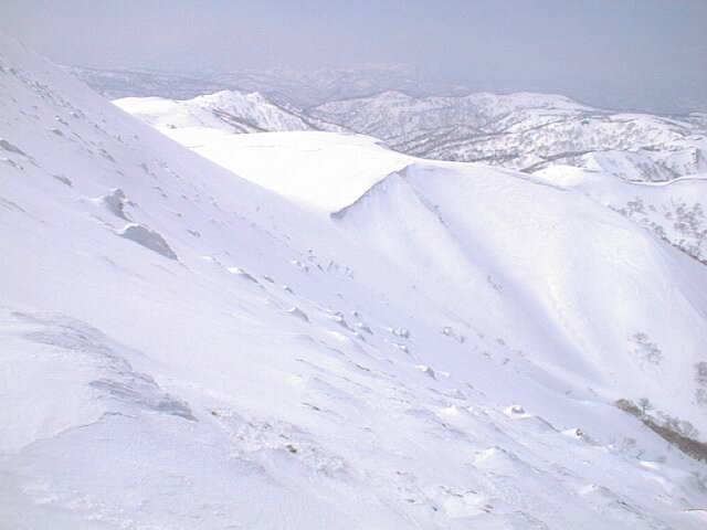 山頂直下はまともに季節風が吹き付けるために雪付きは悪し。かと言ってコルまで尾根を降りてからだと、コルから北に伸びる支尾根からの雪庇崩落が心配(写真左)。と言う訳で、エントリーポイントは山頂とコルの中間付近の雪付きの良い場所を探してとなります。