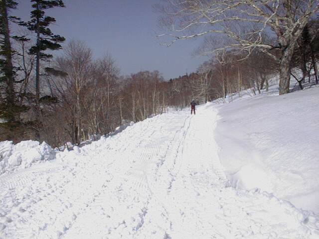 やがて北斜面からのルートと合流し、なおもひたすらなだらかな尾根や小さな支流を水平トラバース状に乗っ越すと、やがてスキー場に出ます。しかしスキー場のこのコース、春は早めに休業している事が多いため、917の東めがけてゲレンデを登り返し、ゴンドラのコースに出ることが出来ます。