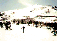 ここからは永山岳方面に比布岳へ登るのが最短コースで,森林限界を超えてますのでスキーも楽しめます。ただ年によっては尾根上に這い松が出ていて、尾根脇の片斜面を山回りターンの連続滑降で、片足ばっかり疲れることもあるかな。