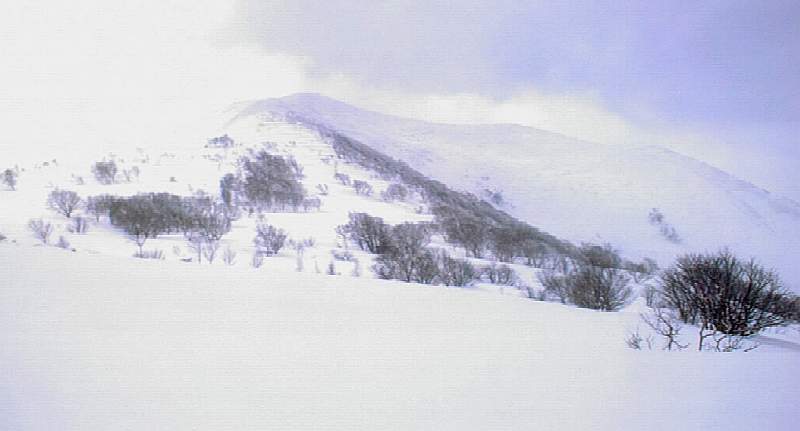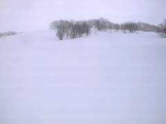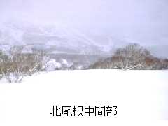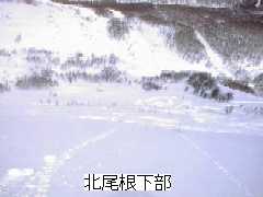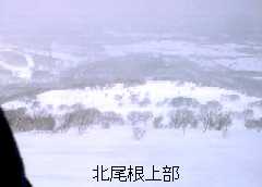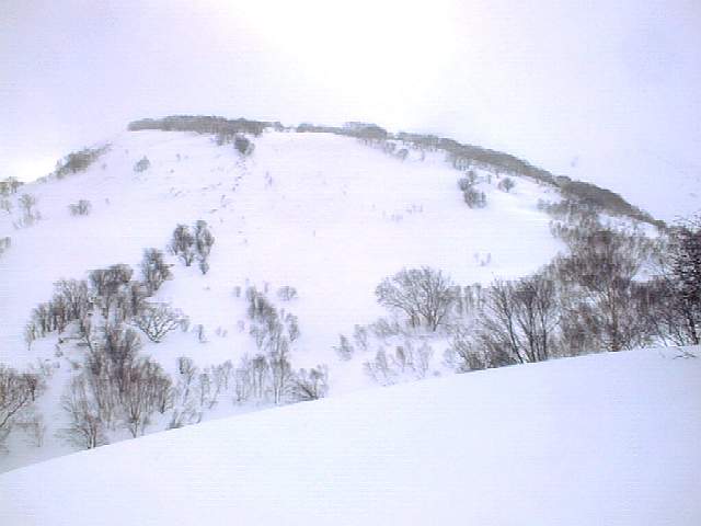 その沢型を登り切ると、北尾根が望めます。尾根の下部にはご覧のようなオープンの、ちょっとした急斜面が広がっています。ただ尾根の東側(向かって左側)のオープンバーンは、上部に雪庇の張り出した、東向きの吹き溜まり斜面なので、雪の安定している時以外は近寄らない方が無難です。