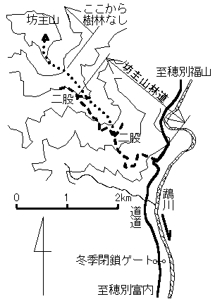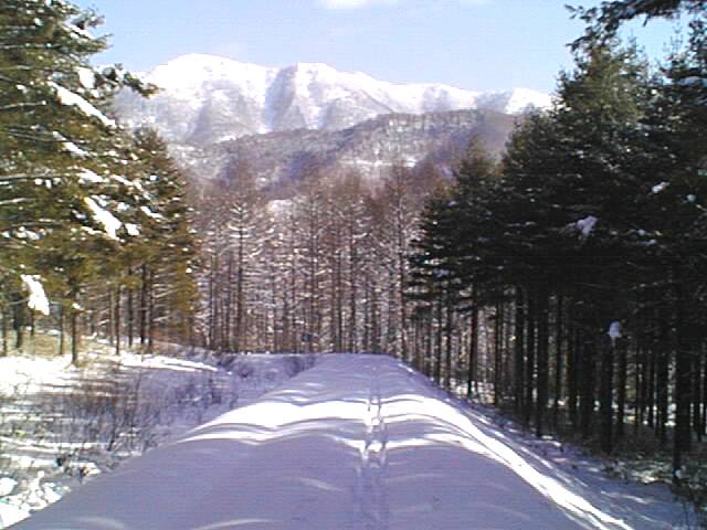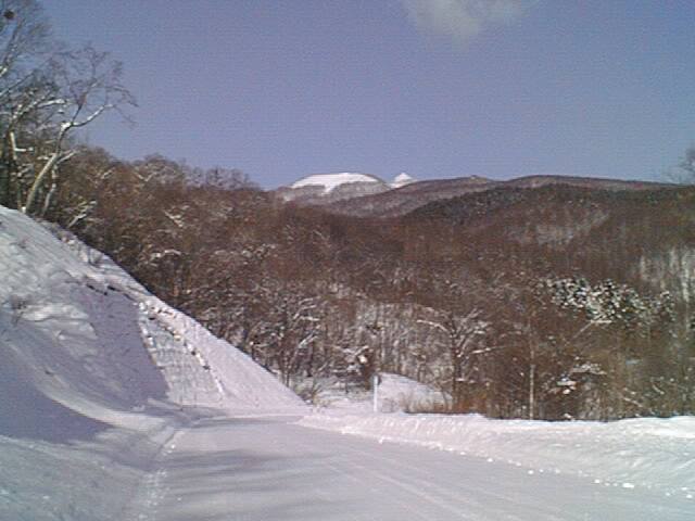 この日はゲートから先も除雪がしてあり、車の走れる道を歩くのはかったるく、余計に疲れてしまいました。写真右の遠くには、白い横長の尾根と、三角の坊主山ピークが見えます。
