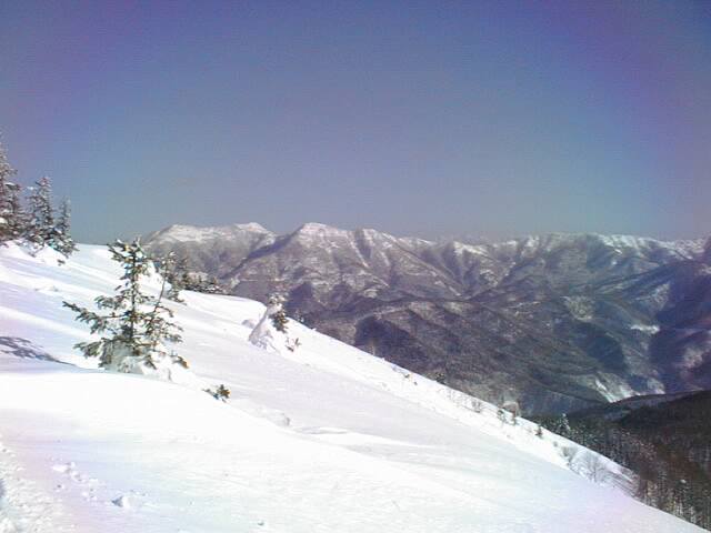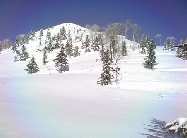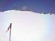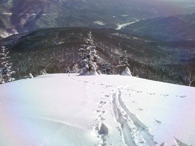 尾根が徐々に急になり、標高が600mを越えた付近で急に樹林が開け、真っ白い斜面となります。この白い尾根は下りの格好のゲレンデとなりますが、木がなくていい斜度ということで、降雪直後は雪崩等に注意して下さい。あまり左に寄らず、尾根筋を登った方が良いでしょう。