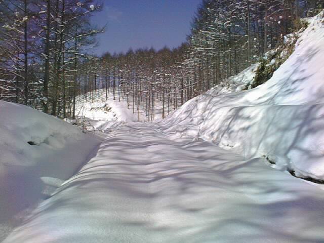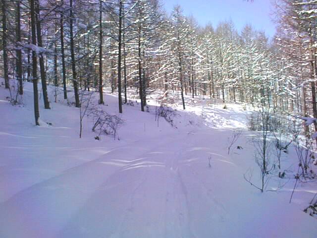 林道も、ほぼ一定勾配で下っているので、トレースさえあれば大半は漕いだり歩いたりせずに下れます。ただ幅広く整備されて味気ない道なので、テレマーク派であれば多少の凹凸も気にせずに、行きも帰りも尾根歩きを楽しんだ方が快適でしょう。