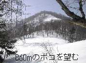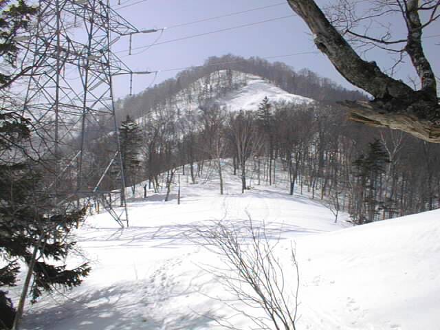 途中送電線をくぐります。写真左に見えるピークは860mのポコです。山頂まではいくつかのポコを越えるので、山スキーにはちょっとかったるいコースです。