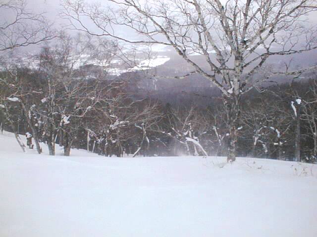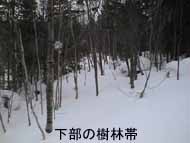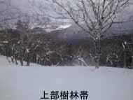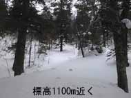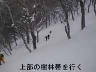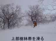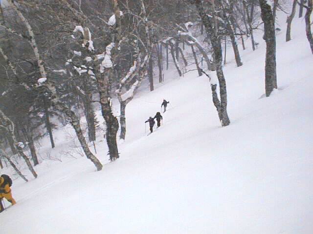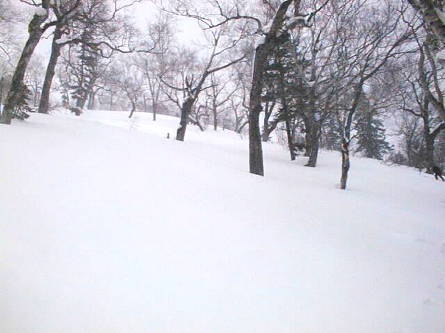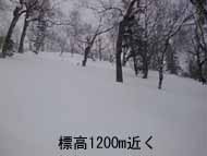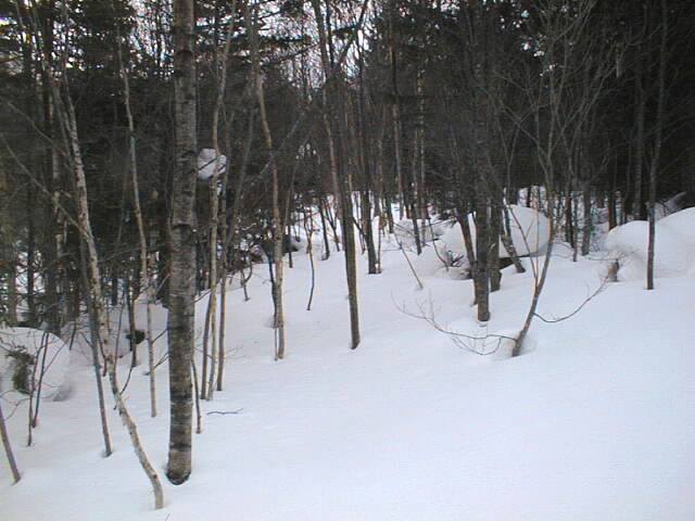 標高1100mを越える付近から斜度も段々きつくなり、樹種が針葉樹林からダケカンバの巨木の疎林と、めまぐるしく変わり、標高差こそ物足りないですが、雪質にさえ恵まれれば、最高の斜面となります。