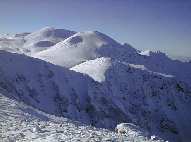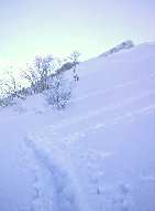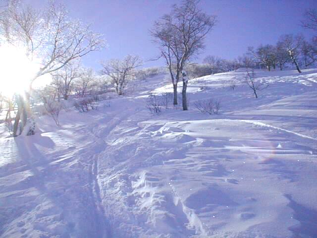 リフト終点から登り始めます。山頂までは、高標高の割には風の影響の受けにくい東向きの、斜度が30度近い標高差500mの見事なバーンが続いています。頂上に行くまでには幾つかのオープンバーンやフリコ状の沢形を滑っては適当に左にトラバースしながらの登りとなります。ここが下りの際は格好のゲレンデとなります。