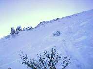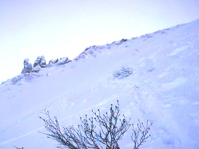 ただ山頂直下のフリコ沢(南側にマネキ岩なるものがある〜写真左)の周辺は、斜度がきつく雪崩がおきやすいので、あまりマネキ岩に寄りすぎないよう、早めに次の沢形にトラバースする方が無難でしょう。