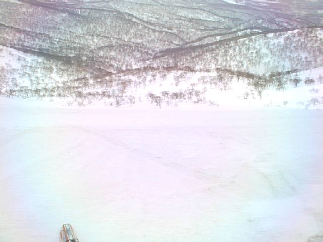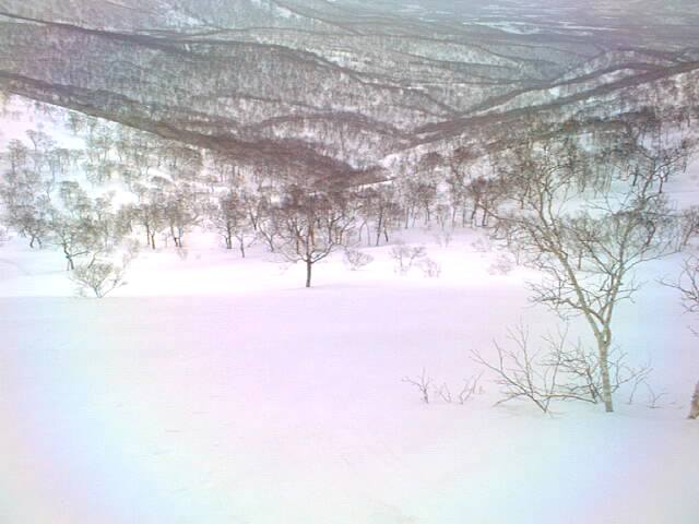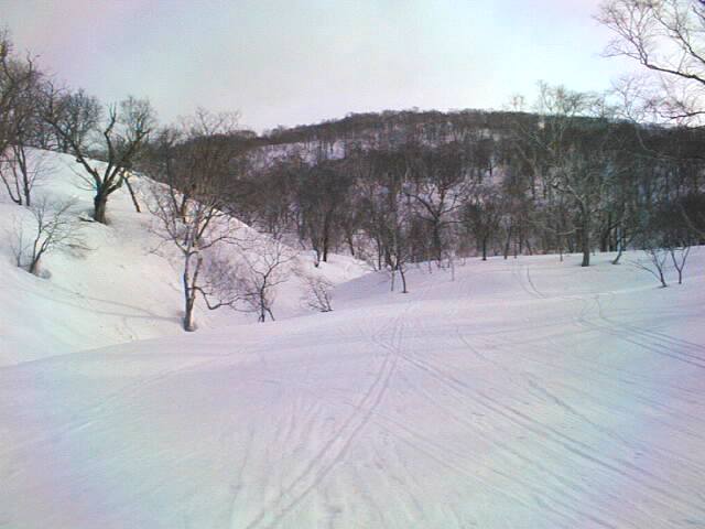 下りはごらんのような、フラットな極楽斜面が標高差300m程続きます。きつすぎず緩すぎず、またこれだけ幅の広い斜面ですから、ウェーデルンなんてせせこましい滑りではなくて、思いっきり斜面幅を使った大パラで決まりでしょう。