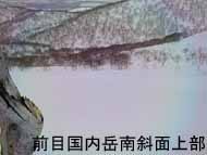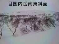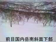 ただ目国内岳で楽しめる斜面は、この南東斜面だけではありません。前目国岳南斜面も、ごらんのようなオープン&疎林のいい斜面です。前目国岳をトラバースするなんてもったいない事言わないで、是非前目国へ登り返す事を強くお勧めします。