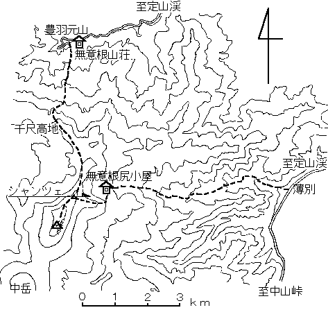 豊羽鉱山からのコースはそこそこ滑れます。無意根山荘前にはちょっとしたゲレンデがあり、そこを登っていって稜線に出ます。でも千尺高地に出てからは、広くて目標物のない、吹きっさらしの尾根になるので、風の強い日や視界の悪い日は注意して下さい。また山頂東側には雪庇が発達しますので、踏み抜かないように。