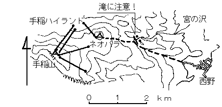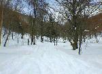 男子回転コースの山頂からまず宮の沢方面へ降りて行くわけですが,でも宮の沢を降りすぎると滝状の深い落ち込みがあるので、降りすぎに注意しましょう。滝の手前から西野の浄水場への沢にちょっとだけ尾根を乗っこします。わざわざシールを付けるほどでもありません。