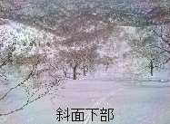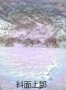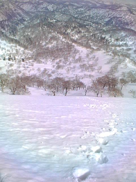 山頂からは、日射の影響を受けにくい、ややすり鉢状のご覧のような大斜面を滑走できます。この写真を見て頂ければ、私からはあえて付け加えて言う必要はないでしょう。