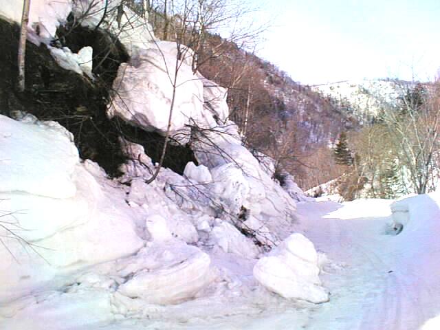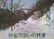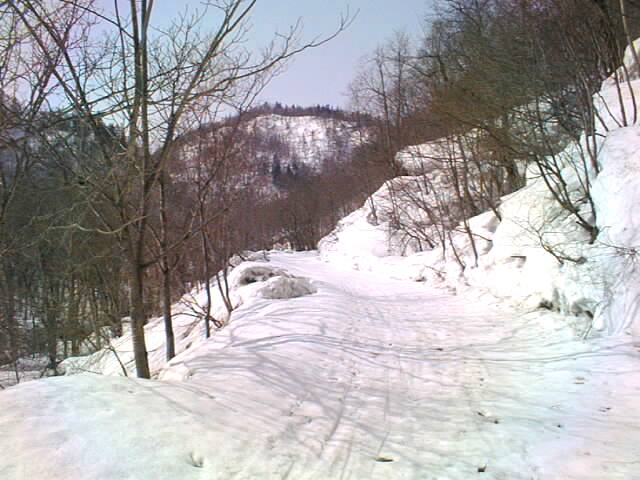 極楽山スキーもあっという間。後はまたひたすら単調な林道です。砂金沢沿いの林道は、小さなブロック崩壊跡やら、上部から全層雪崩が来そうな所を多く通過しますので、雪が緩んだ帰り道は、一応山側を警戒して下さい。