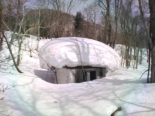 約6km程で、地図に記載のある避難小屋ですが、ここは林道より一段段丘上にありますので、林道からは見えません。また避難小屋とは名ばかりの廃屋でして使用できません。
