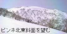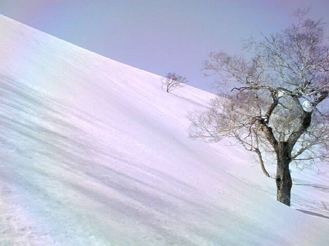 この斜面はご覧のような、下部はダケカンバの疎林、上部はオープンな極楽斜面です。ただしピンネシリの南東稜線には雪庇が張り出していますので、そこからの崩落には注意しましょう。また残雪期とは言ってもこれだけのオープン斜面、雪が不安定と感じたときは雪崩に十分警戒しましょう