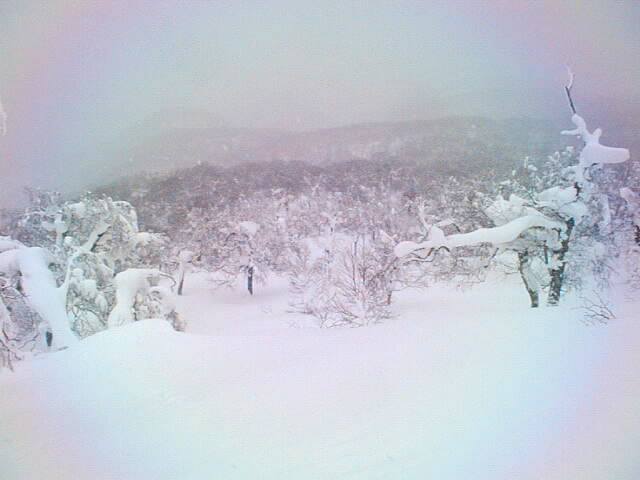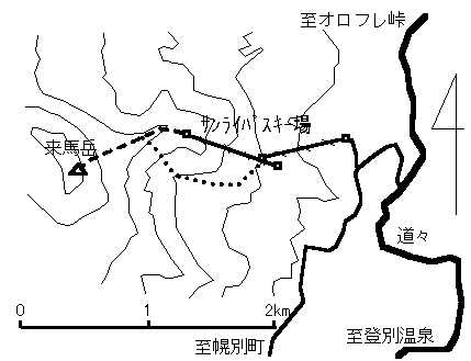 山頂から沢源頭部へも、開拓次第では幾つかルートも取れると思いますが、雪崩のリスクは尾根コースより高くなりますので、ご自分の判断で。また選べば天然のハーフパイプやらシュートのコースも取れて、山ボーダーにも魅力大のコースですが、サンライバスキー場の第二リフトは、残念ながらボード客禁止でした。