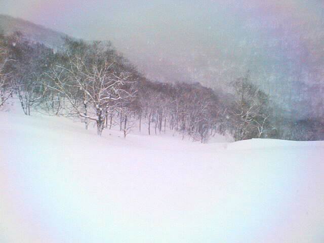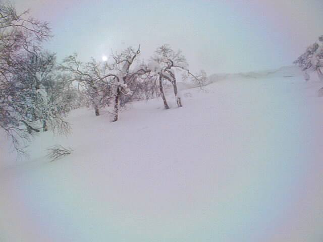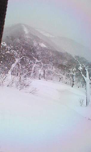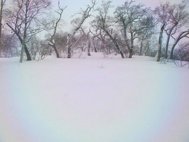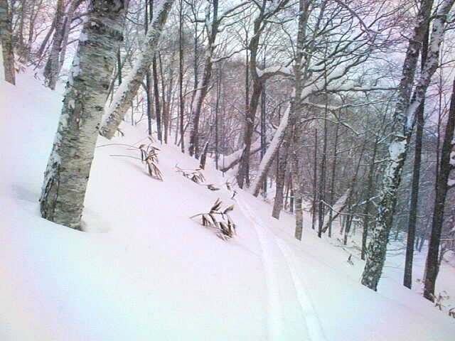 山頂の雪庇の切れ間をジャンプすると、30度近いダケカンバの疎林の斜面。風や日射の受けにくい東斜面なので、厳冬期はディープパウダーを堪能出来る事でしょう。