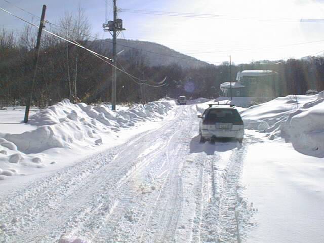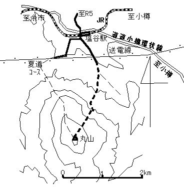 ツアー尾根に取り付くにはまず、塩谷駅から踏切を跨いですぐの二股を左に曲がります(右に行くと夏道コース)。そこから1km弱進んで送電線をくぐった所で除雪終点。