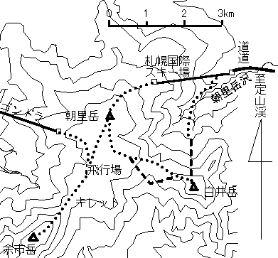 このコースは、札幌国際スキー場のキャビンを使うと、登りで標高差300mを登るだけで、標高差650mを下ることが出来るという、虫のいいコースです。