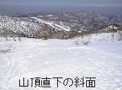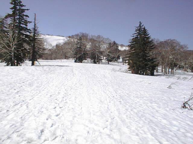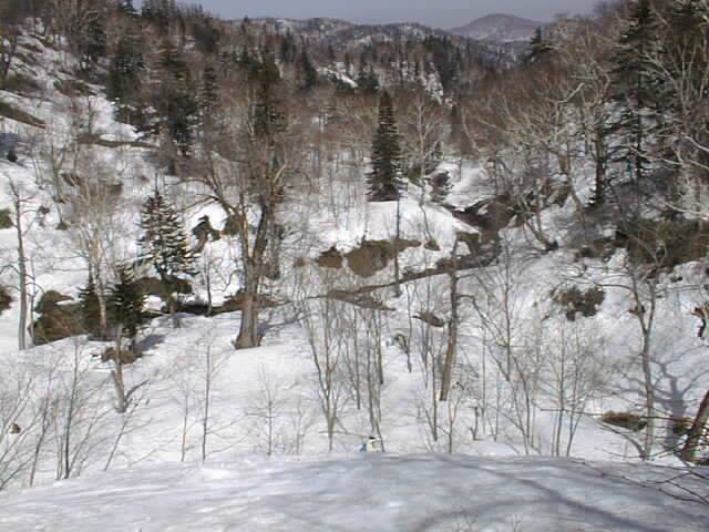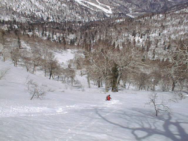 山頂から朝里岳沢左股の源頭の、標高920mにかけては、格好の山スキー向き斜面が広がっています。カンバの疎林を縫うこの斜面は、風によるクラストもなく、厳冬期はふかふかのパウダースキーを楽しめます。