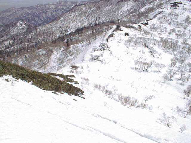 雪が安定していれば(雪庇にもご注意下さい)、源頭までの斜面を楽しんだ後、白井岳へ直登する方が、やせ尾根をトラバースしながら歩くより、よほど快適でしょう。