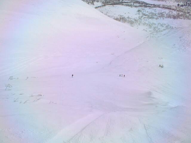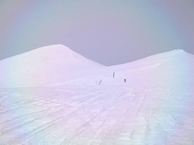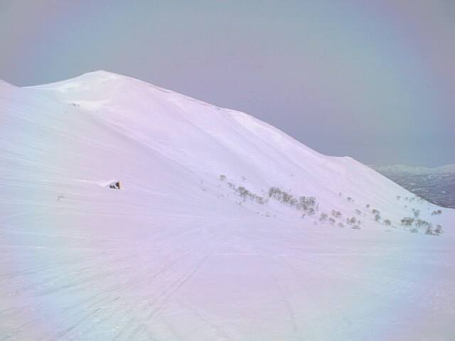 特筆すべきはこの無名峰からの下り斜面です。森林限界のオープン斜面でありながら、風の影響を受けにくいこの東斜面は、厳冬期にパウダーを求める人に人気があります。帰りにちょっと登り返しがありますが、是非どうぞ。但し長沼方面に行けば行くほど雪庇が張り出して、雪崩のリスクが高くなりますので、北寄りには滑らない方が賢明です。( ”ニセコの雪崩危険個所マップ”にも危険区域に指定されています)