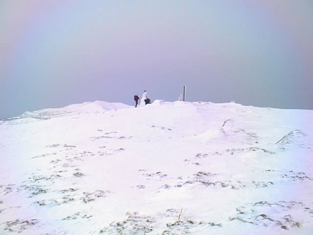 急登を越えると、以外となだらかで広い山頂着。後はお待ちかねの下りです。雪の状況が不安であれば、登った夏道尾根を。雪が安定していれば南尾根か、オープンの南斜面を一気に滑ってスキー場へ。