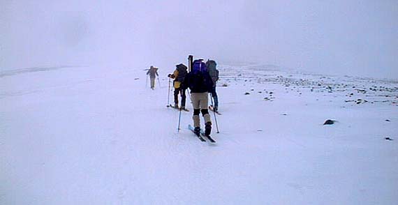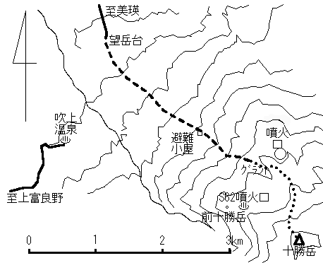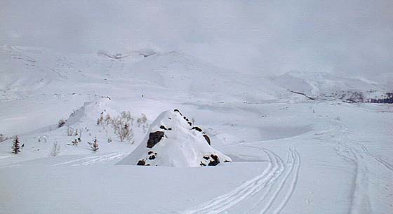 またグランドからは先は、西風が吹くとS62火口からの噴煙がまともに吹き付けます。おまけに雪付きはもっと悪くて、厳冬期は当然気象条件も厳しいと言う訳で、ここでは雪が締まったザラメの残雪期に、雪着きが程々良い、望岳台〜通称グランド(1660m地点)区間までの紹介にとどめておきます。
