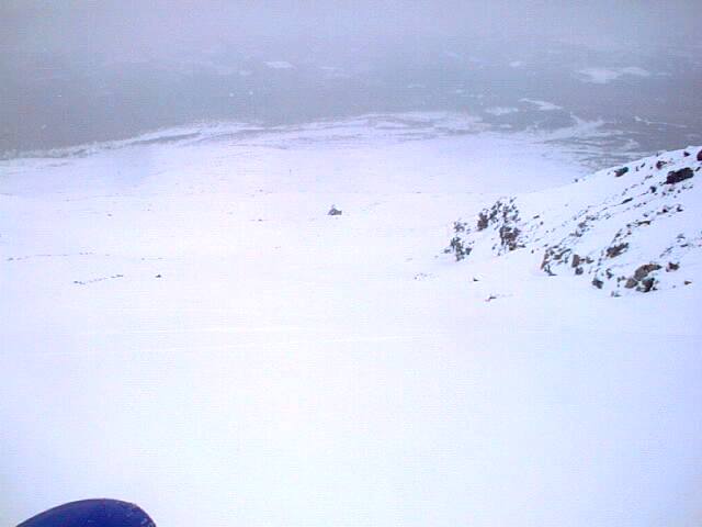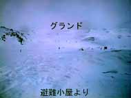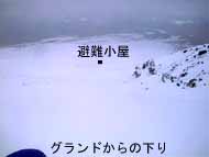 グランドから避難小屋までは、程良い斜度の良いスロープが広がっています。なるべく凹状の真ん中を滑ると安心ですが、それでもあちこちに岩が出ていますので、くれぐれもご注意を。