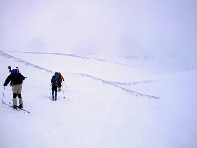 避難小屋から先は、夏道通りの尾根筋だと雪着きが悪いため、1660m地点の通称グランドまで、凹状の斜面を詰めて登ります。この区間は程々の傾斜のスロープで、帰りに期待を持たせます。