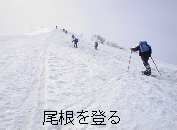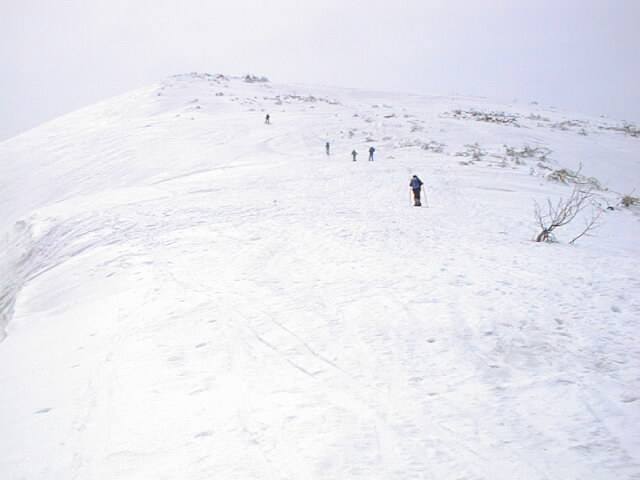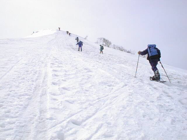 この尾根はご覧の通り傾斜がきつく、また厳冬期は南東方向に雪庇が大きく張り出し、尾根もクラストしてガリガリの時もありますので、慎重に登りましょう。