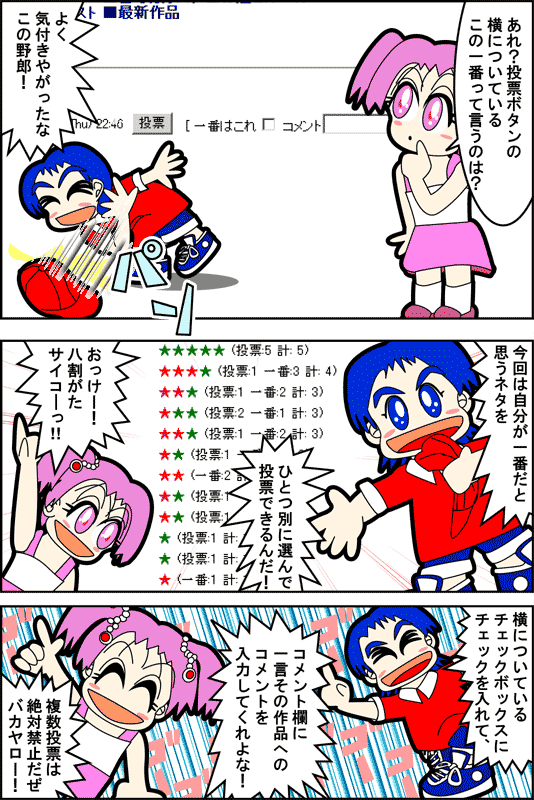 ・このネタが一番だと思うネタの投票の場合には、投票ボタンの横の「一番はこれ」チェックボックスに チェックを入れ、さらに「コメント」欄にネタに対するコメントを書き入れてから投票ボタンを押して ください。 どちらかでも欠けると投票できません。 たいへんめんどくさいですが重複投票を避けるためです。ご協力ください。