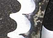 | せっかくチェーンを代えるのだからスプロケットもピッタリ合う物にするべきでしょう。写真は新旧のリアスプロケットを重ねた所です。手前に置いた古い方の歯が痩せているのが解るでしょうか。山が尖り、谷が大きくなってます。これだけ痩せていればフロントのスプロケットも同様でしょうが、モトラの場合副変速機があるせいで左クランクカバーを開けるのが面倒。今回は交換しない事にします。 私はM113というキャタピラ式の装甲車のマニュアルを持っているのですが、それを見ると、キャタピラの伸び、キャタピラのたるみ、スプロケットの減り、等を一枚の変な形の板をゲージにして簡単に確認できるという優れ物が有るのです。多分、他の戦車等にも同様のゲージは有ると思います。そういう物をバイクにもセットして欲しいなぁ・・・と今回は実感。許容範囲がどの程度か感覚的に解り辛いですもの。 リアスプロケットはリアホイールのハブにリングで止まっています。このリングは手持ちの工具では上手く外せませんでした。これの為にリングプライヤーを買うのもシャクなので、友人のいるガソリンスタンドに行き外して貰いました。さすが専用工具。あっという間に外れました。うーん。あの手この手を使って四苦八苦したのが馬鹿みたい。 (1999年夏) 後日談・・・ 新しいタイヤで調子にのってオフロードを飛ばして・・・転倒! 左の肋骨に激痛が・・・でも、左側だったのは幸いで、片手運転でなんとか帰る事が出来ました。いいぞカブ系!。 その後、自然治癒させるつもりでしたが、2週間ほどすると痛みが酷くなって、たまらず病院へ。レントゲンで骨にヒビが入っている事が分かりました。聞くと、ちょうど2週間目くらいが痛みのピークなんだそうです。それを知っていれば我慢したのになぁ・・・。 なお、後に、副変速機を開けた事もあってフロントスプロケットも交換しました。やはり、スプロケットが減っている場合は、前後同時に交換すべきですね、チェーンがすでに伸びてます。また、リングプライヤーも安くて良いのを買いました。そしてモトラを置いて行く事件が再度・・・次もどうぞ |