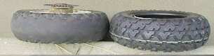 | ある日 とても天気の良い日曜日、中山峠の駐車場でモトラを止めて休んでいました。たまたまそこにピッカピカのシルバーゴリラに乗ったお姉ちゃんと、さらにバリバリのチューニングゴリラの兄ちゃんが来たので声をかけ、見知らぬ三人でモンキー話なんかして楽しい時間を過ごしました。私のモトラはタイヤが丸坊主で、カーカス(補強の繊維)が見えるくらいの状態でして、2人に信じられないという目つきで見られてしまいました。 その帰り道、先に峠を下っていったチューニングゴリラ氏が、芝生にバイクを止めて困っている場面に遭遇。工具やプラグ等を貸しつつ調べてみると、キャブが詰まっているのか、ガスが燃焼室に来ていない感じで始動しません。彼は友人の車を携帯で呼び、いったん帰ってから自分の車でゴリラを取りにくる事にした様です。さぞかし愛するバイク(しかもただでさえ盗まれやすいゴリラ)を置いて帰るのは不安だろうなと思いつつ私はその場を後にしました。 その翌日・・・ モトラで走っていると、タイヤから妙な音がするな・・・と思い縁石に乗り上げたところ、グニャっと後輪が横滑り。直ぐに「タイヤがイッタな」と分かりました。普段からパンク修理剤は持ち歩いているのですが、走行中バコンバコンっと音が聞こえる程ならさすがに修理出来ないだろうと思いました。実際見てみると、露出した繊維部分が2センチほど裂けて大穴が開いていて、たとえ修理剤でチューブだけを塞げたとしても気休めにしかならない事は確実でした。結局、前日の彼の心境を味わう事に・・・。モトラを近所の駐車場に押して行き、5駅分をJRに乗って帰り、車でカバーを持って再度現場に行き、とりあえず一晩置いておく事にしました。あー心配。 その後、ホンダウイングに行きタイヤを注文。ホンダ純正の部品なら大抵翌日とか中1日とかで届くので、もし在庫があるなら、それを直接現場に持って行き、路上でタイヤ交換しようかと思っていました。しかし、タイヤはブリジストンから取り寄せる上、現在は使われていないサイズのタイヤのため、地元に在庫は無いとの事。ちなみにサイズが合っていれば、どのパターンのタイヤでも良かったのですが全て(と言ってもブリジストンでは三種類)在庫が無いそうです。結局、関東以北には無いらしく大阪から取り寄せることになったのですが、届くまで1週間掛かるとの事。 さらに翌日・・・ さすがに1週間もモトラを放置するわけには行きません。結局、車でモトラの後輪だけ外して持って帰り、応急処置をする事にしました。幸運なことに片側のビードが外れていたので簡単にチューブを引きずり出せました。以前、パンクを自分で直そうと思いホイールを開けた事があったのですが、どうしてもビードが外れず、結局諦めて店でチューブを交換してもらった事がありました。どうやらその時、店で外した過去があった為にビードが簡単に外れたようです。 応急修理 さて、チューブは自転車用のパンク修理キットで、パッチ張りすることにしました。普通のパンクならこれで十分な筈です。ゴムのり等はキットの物で十分ですが、パッチは大版サイズのハサミで切って使う奴にしました。今回はタイヤ側にも大きな穴がある訳で、ここも裏側からパッチを当てました。チューブとホイールを元通りの位置に組めば、パッチは2重になるので十分だと思います。さらに、裂けた部分が広がらない様に、「シューズドクター」を表面にたっぷり塗り万全(?)の体制をとりました。(シューズドクターは電気のリーク止め、ねじの緩み止め他、応急処置に何かと活躍します。) さて、今度は出来あがったホイールをモトラに組みに行きます。人に見られて恥ずかし思いをしながら作業し、なんとか出来あがりました。後は車を置いてモトラで帰る番です。・・・実はモトラを置いていた所は、良く手入れされた社員用マンション(部外者立ち入り禁止の札付き)の物置裏で、盗難の心配は少なかったのですが、管理人に見つかったら追い出されそうな感じでした。幸い今まで見つかる事は無かったのですが・・・モトラをスタートし、走り出した時、なんとも運悪く管理人が帰ってきて鉢合わせになり、エライ怒鳴られてしまいました。なにせこちらはトラブルで弱気になっていたので恐縮するばかり。事情を説明し、車をしばらく駐車場に置いていく事を承諾してもらって帰ってきました。 暫くあと 新品のタイヤが届きました。オリジナルと同じブリジストンのレクタングル2です。たしかニットーから出ていたスズキRV90バンバンはレクタングル(の1)を履いていたなぁ・・・とか、タイヤ横に「RE2」って書いてあるけれど「RE711改」の遠い先祖だったりして・・・とか馬鹿なことを思いつつヒゲの生えた新品タイヤを撫でるのでした。思わず撮った写真が上の画像という訳です。どうです!。同じタイヤに見えないでしょう。自慢するのも変ですが、タイヤ君も成仏した