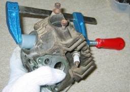 (!?)もオイルを消費するだけあって、燃焼室のカーボンは凄まじい物でした。そのままカーボンを除去するにもバルブ周辺は綺麗に取れないので、バルブを外す事にしました。ああ、思えば2年前諦めて店に頼んだ作業・・・。ネックは工具「バルブスプリングコンプレッサー」のお値段、七千〜八千円はするようです。そこで、手元にある安物クランプを利用しアタッチメントを作ろうと思いました。新たにかかった費用は35円!。ホームセンターで売っている樹脂製の水道管のキャップの一番細い奴がサイズ的に合いました!。そのまま使ってもOKですが、内側をちょっとテーパー状に削ってリテーナーとの当たりを馴染ませました。 ただし、現時点ではバルブを外すのみで、填める作業は出来ません。その時はその時で何とか考えましょう。 |