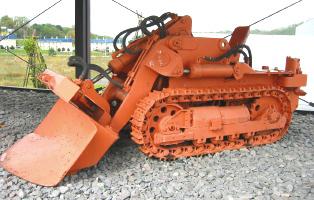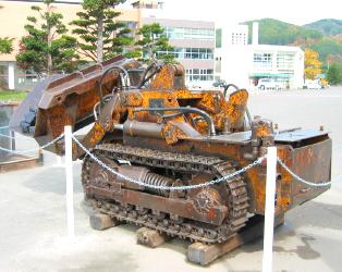 2003年9月26〜29日に開かれた「国際鉱山ヒストリー会議赤平大会」に合わせて赤平の街角に展示された物。でも、その後(10月中旬現在)も残されているので、町のモニュメントとして保存展示されるのかもしれない。だとしたらチョットいいね。 全体に防錆用と思われるクリアー塗料が塗られて強烈なギトギト感があった。でもこれは、オリジナルの雰囲気を損なう事なく露天展示出来る上手い方法だと思った。というのも、赤平に近い上砂川にも同様の車両が展示されているのだがこんな感じで塗り直され、個体のヒストリーが感じられなかったから(屋根の有る良い展示なのだが、その一点が残念)。 さて、『サイドダンプローダ』なる名前は説明板で知った。坑道用らしくコンパクトな車体で、鉱石をすくい上げ、後退し、バケットを横に傾けて炭車に積み込む用途に特化している。1本の油圧シリンダーを、バケットの左右どちらかに付け変える事で、傾ける方向を設定できる。赤平のは左側へ、上砂川のは右側へ傾ける様だ。 赤平では、バケットを持ち上げ、オリジナル塗装を残してあるなど、上砂川と異なった展示を心がけている様だ。ディテールも異なるところが有るので車で行くなら近所だし両方見ておきたい。 メーカーは三井造船。これはトラクターで言えば3トンクラス程度の私好みのサイズで、個人的な趣味から外れる「建機に近い炭坑マシーン」だが見れたのは嬉しかった。きっと、三井系の炭坑では良く使われていたんだろうね。年式は分からないけど戦後なのは間違いない。 |