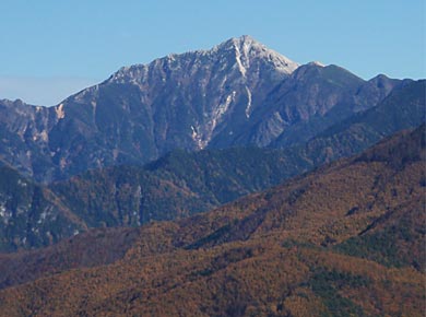 ↑前頁の木曽駒ヶ岳付近の拡大。↓木曽山脈の北(右)端、経ヶ岳。両側に北アルプスも見えます。