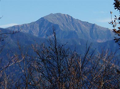 ↓穂高、槍ヶ岳の拡大(中央が穂高岳、右が槍ヶ岳)。乗鞍岳↑。
