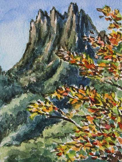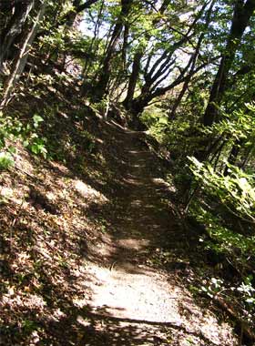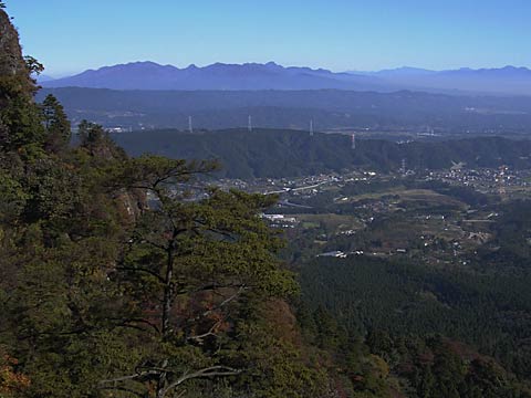 ↑妙義神社社殿。重要文化財だそうで、壮麗なつくりです。妙義山はぼろぼろした感じの岩山で、上に登ると転げ落ちそうなので、中間道という遊歩道を歩く予定でした。ところが、地図を広げるのを面倒がって社殿から横にはいる道を見落とし、登山者グループの後についていってしまったため、だいぶ上の「大の字岩」まで登ることになってしまいました。 |