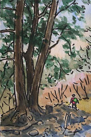 下社からの湘南海岸方面の眺め。左、二本の木の間に江ノ島が見えます。